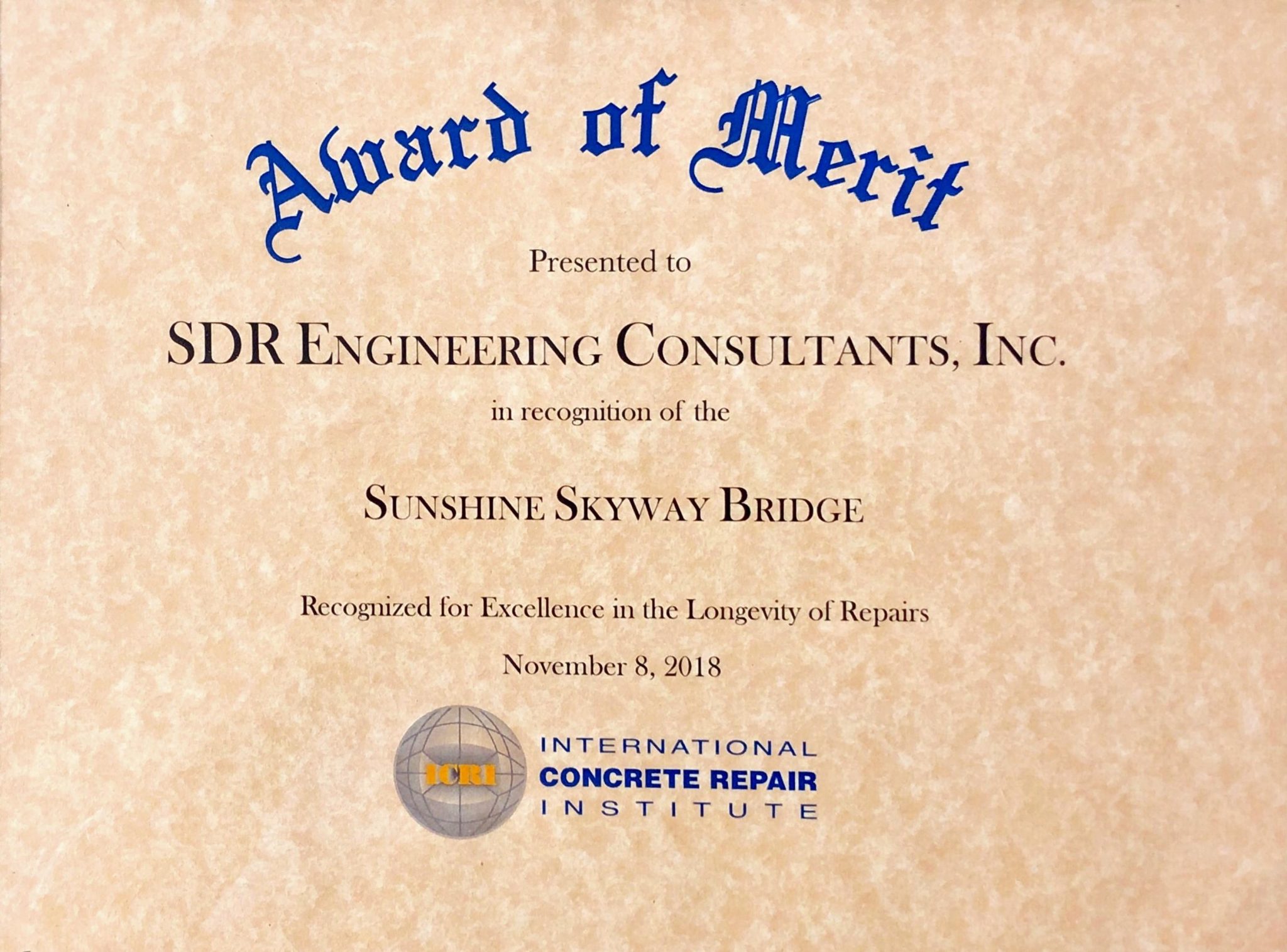 • Award of Merit presented by the International Concrete Repair Institute (Nov. 8th 2018) — Awarded in recognition of excellence in the longevity of the repair performed by SDR ten years prior on the Sunshine Skyway Bridge trestle span.
