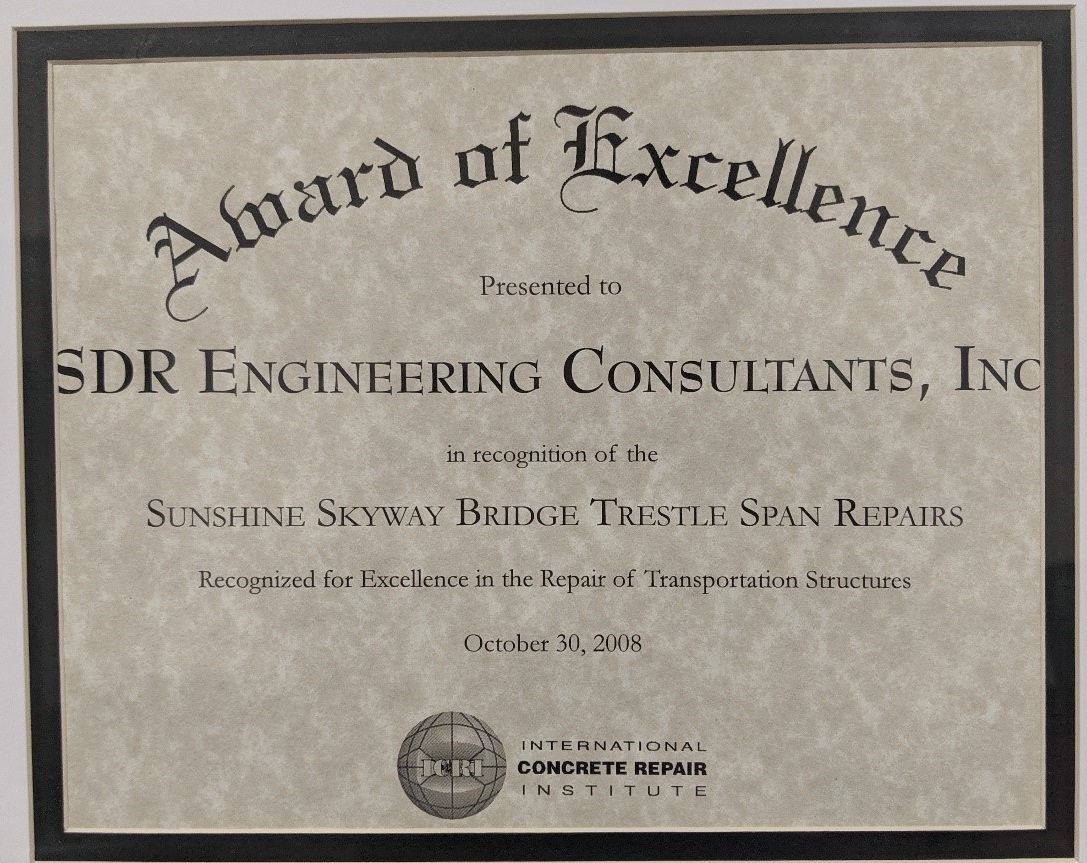 • Award of Excellence presented by the International Concrete Repair Institute (Oct. 30th 2008) — Awarded in recognition of the repairs facilitated by SDR on the Sunshine Skyway Bridge trestle span.