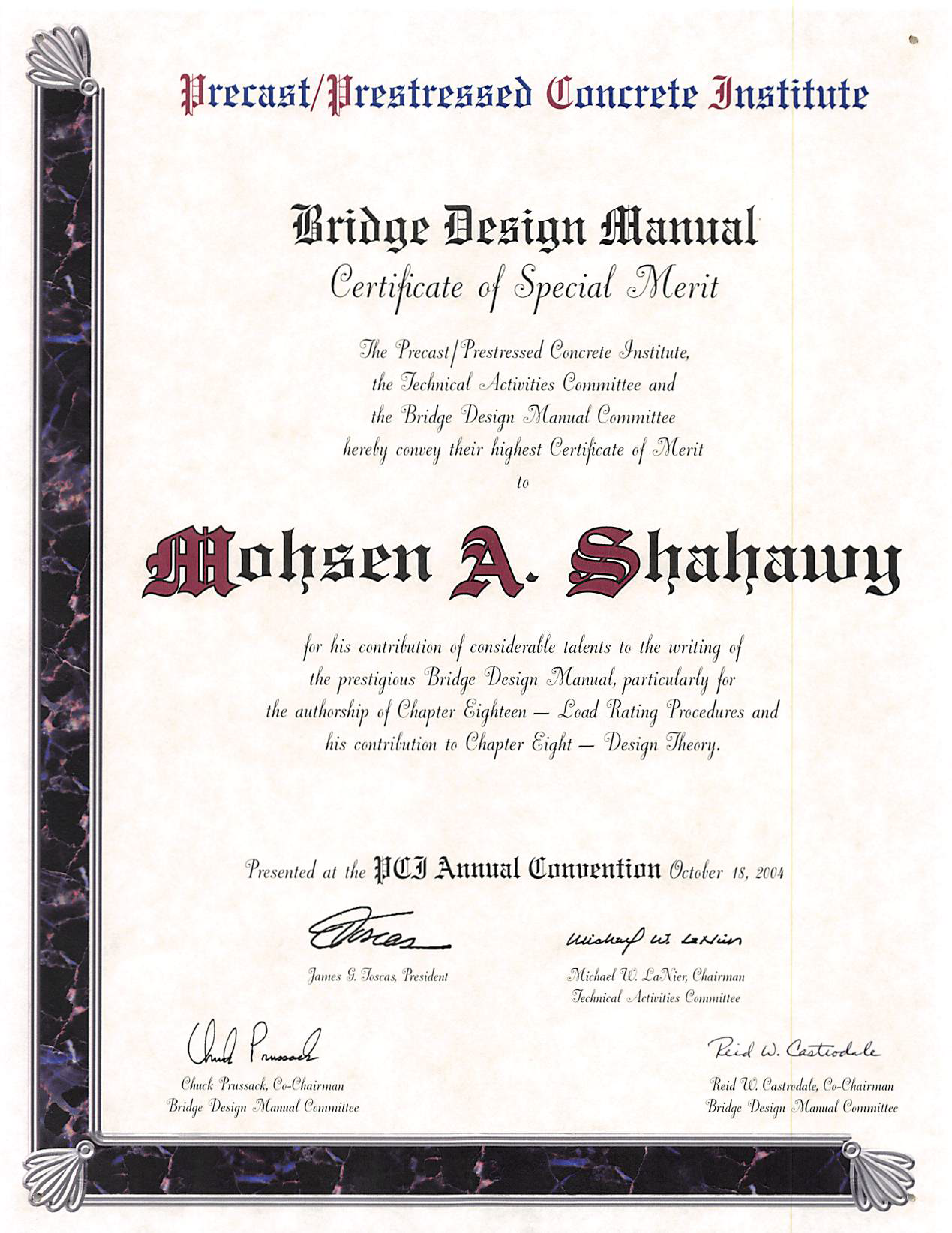 • Bridge Design Manual Certificate of Special Merit — The precast/prestressed concrete institute, the technical activities committee, and the bridge design manual committee hereby convey their highest certificate of merit to Mohsen A. Shahawy for his contribution of the considerable talents to the writing of the prestigious bridge design manual, particularly for the authorship of chapter eighteen – load rating procedures and his contribution to chapter eight – design theory.