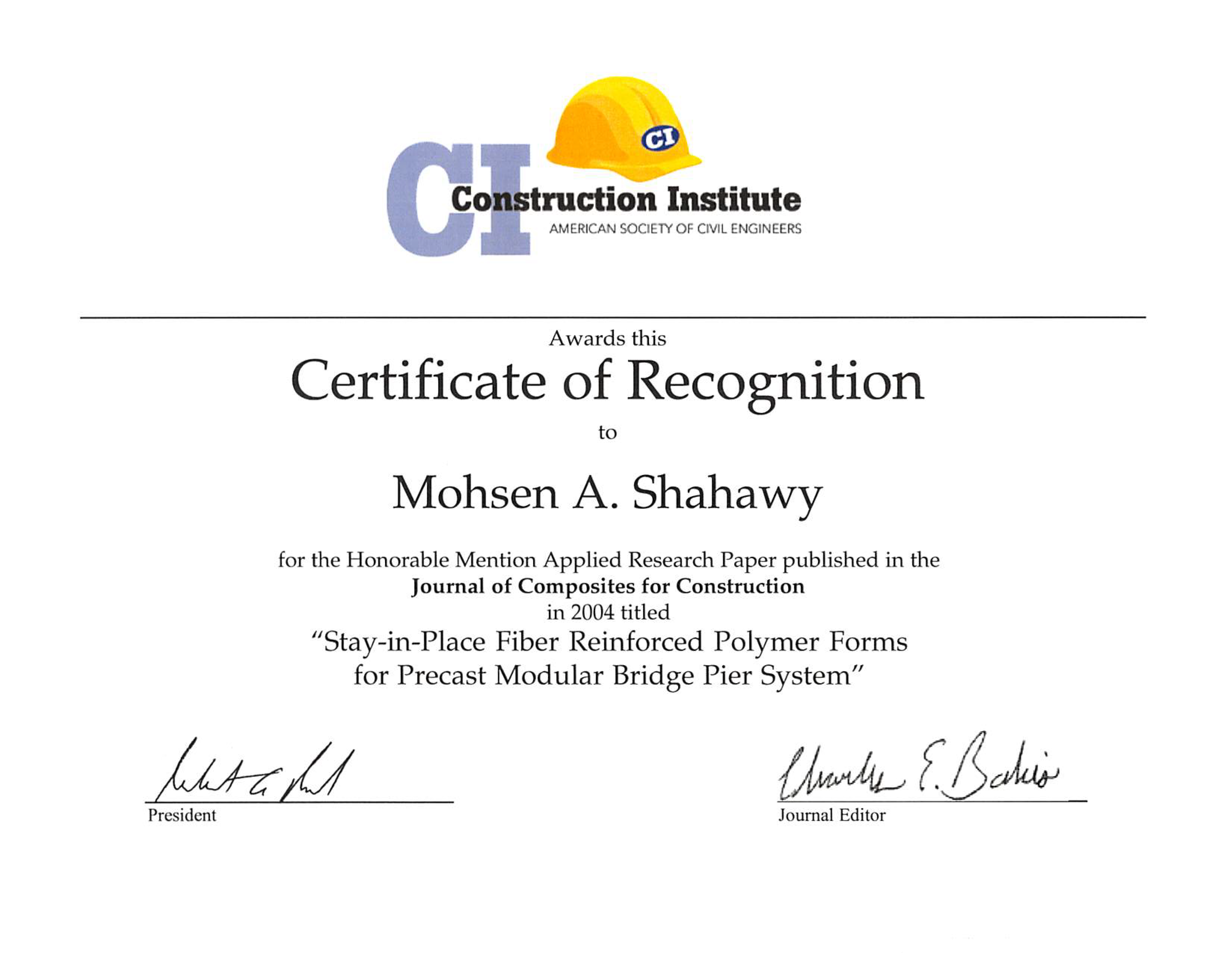 • Construction Institute Certificate — Construction Institute awards Mohsen A. Shahawy for the honorable mention applied research paper published in the journal of composites for construction in 2004 titled “Stay-in-place Fiber Reinforced Polymer Forms for Precast Modular Bridge Pier System”