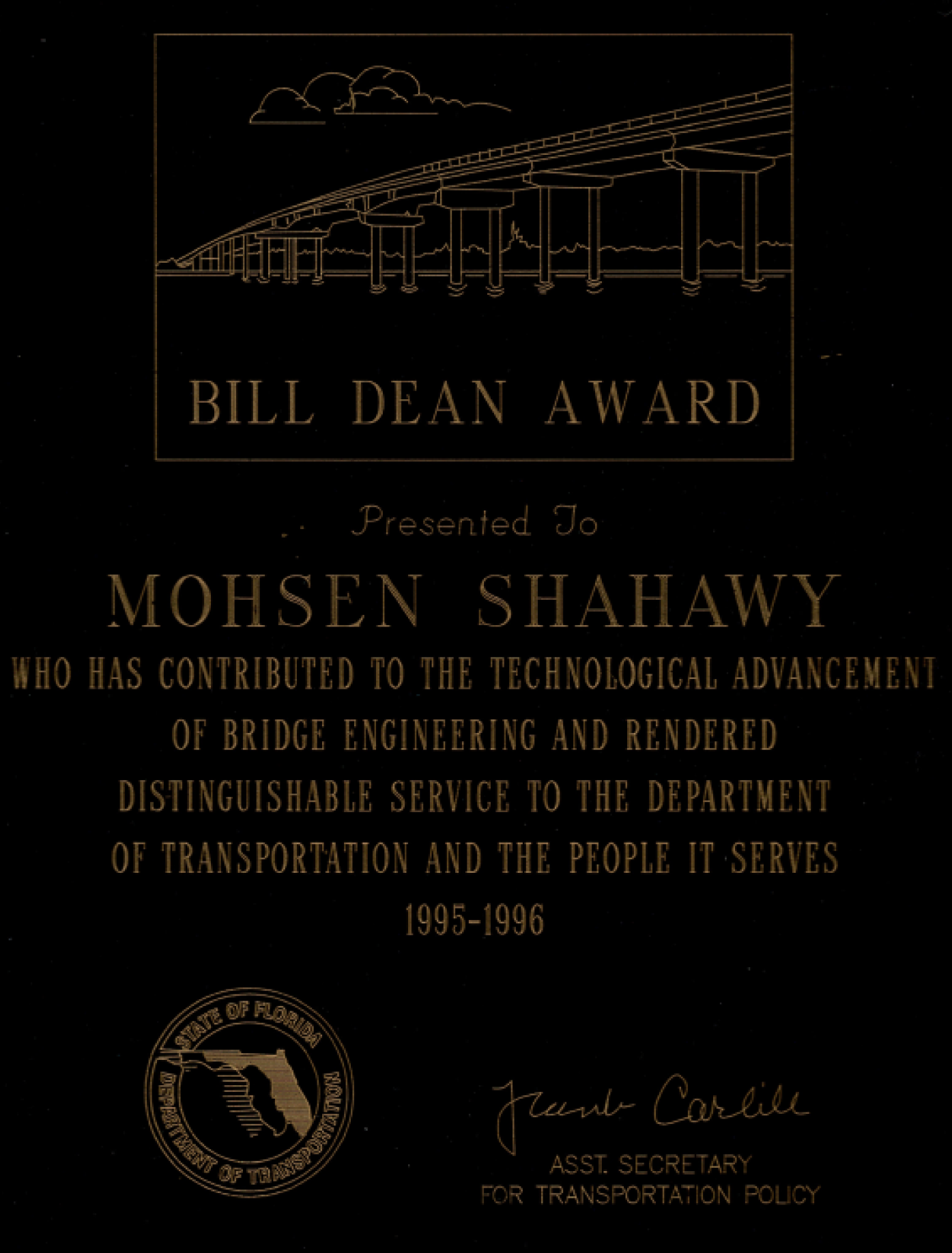 • Bill Dean Award — Bill Dean Award (1995-1996) was presented to Mohsen Shahawy who has contributed to the technological advancement of bridge engineering and rendered distinguishable service to the department of transportation and the people it serves