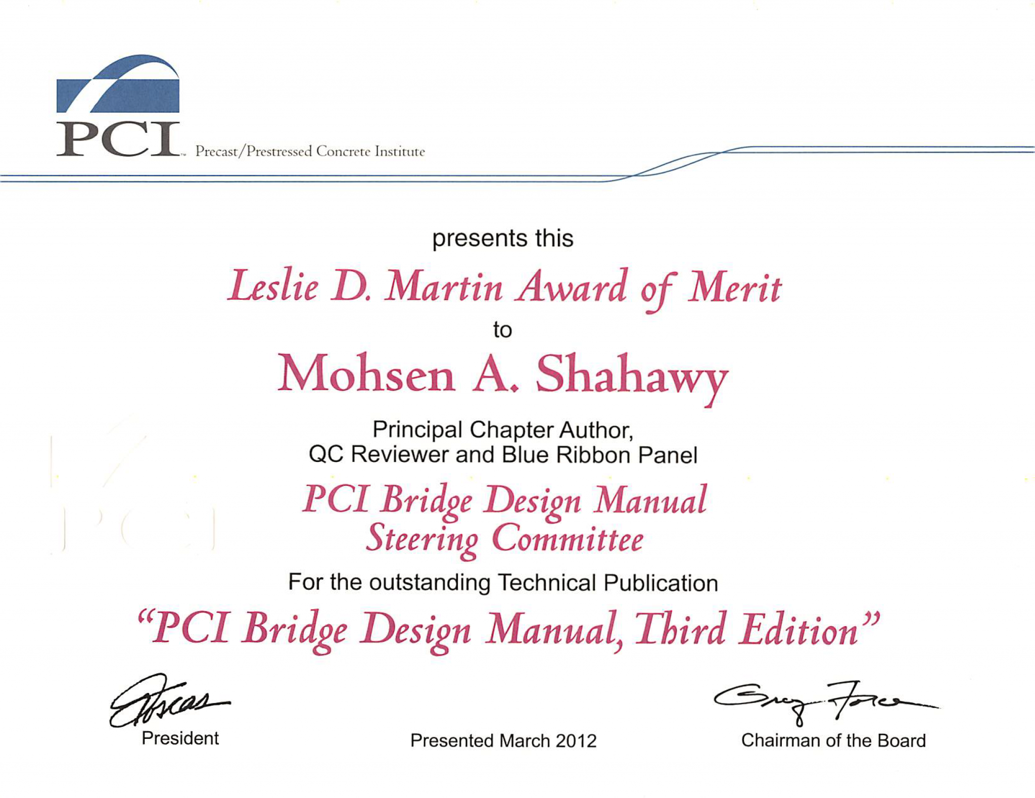 • PCI Leslie D. Martin Award of Merit — PCI presents the Leslie D. Martin Award of Merit to Mohsen A. Shahawy for the outstanding technical publication “PCI Bridge Design Manual, Third Edition”