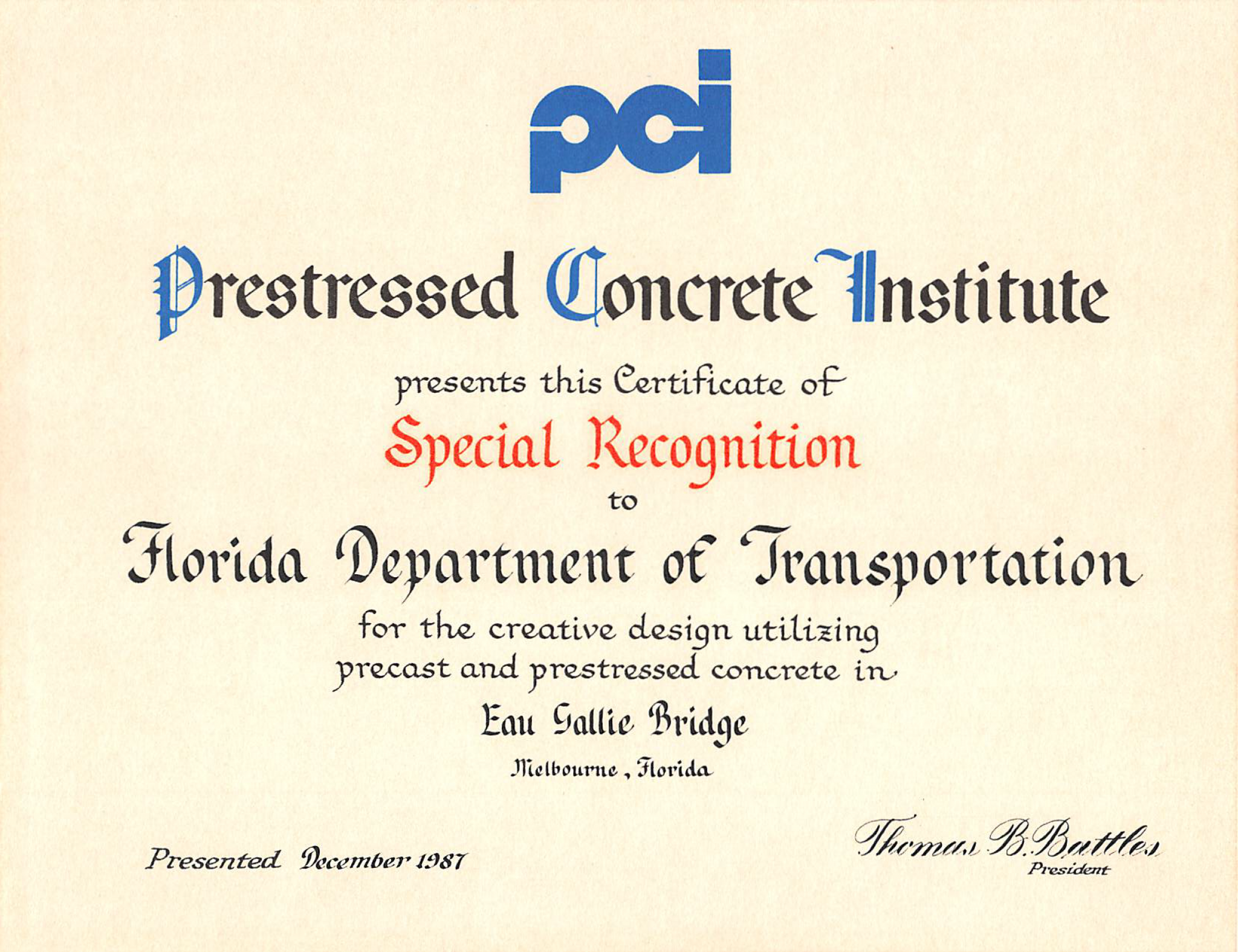 • PCI Certificate of Special Recognition — PCI presents the certificate of special recognition (1987) to the Florida Department of Transportation for the creative design utilizing precast and prestressed concrete in Eau Gallie Bridge