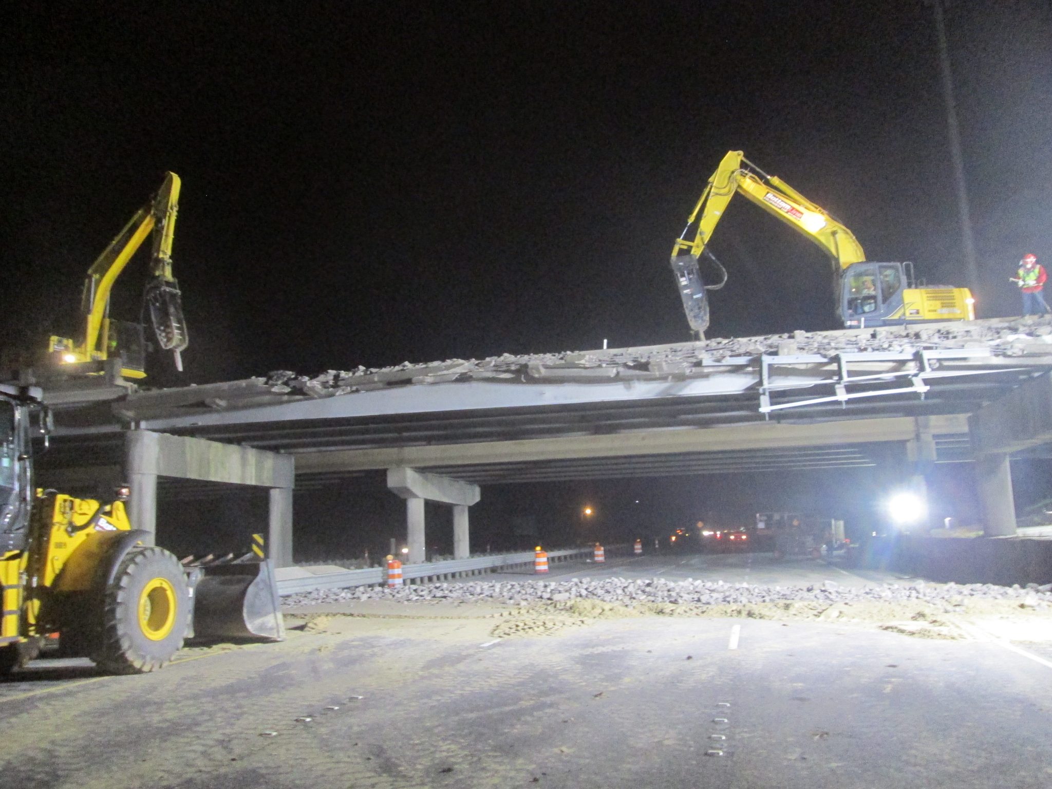 The repair was performed by removing a segment of the second span at the splices, assembling the new segment on-site, and sliding in place a self-propelled modular transportation (SPMT) vehicle. This allowed for minimum highway closure.
