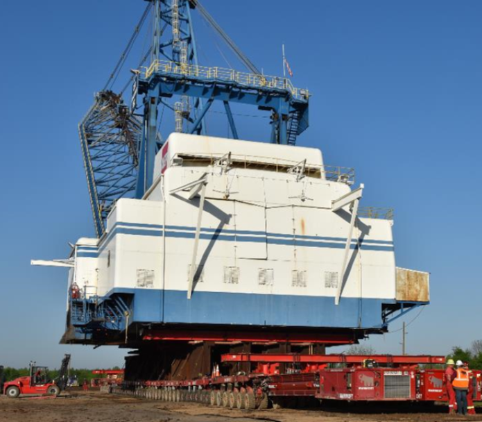 The Bayou Pierre bridge in Louisiana has five equal spans with a total length of 500 ft. The superstructure consists of 10 PPC girders, and the substructure consists of reinforced concrete caps and steel piles. The 10,000 kips (4,500 tons) DRAGLINE crossed the bridge under continuous monitoring using 46-axles SPMT, taking 85 minutes.